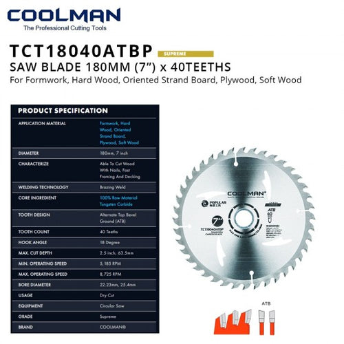 Coolman TCT18040ATBP Saw Blade 7" (DIA) x 40T x 22.23MM (BD)